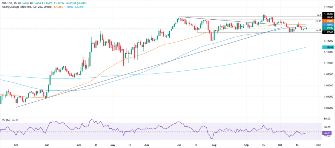EUR/USD technical view improved slightly but remains neutral as the pair trades below the confluence of the 20-day and 100-day simple moving averages (SMA) at 1.1653 and 1.1658, respectively. The Relative Strength Index (RSI) has fallen below the neutral 50 level, indicating increasing bearish momentum.