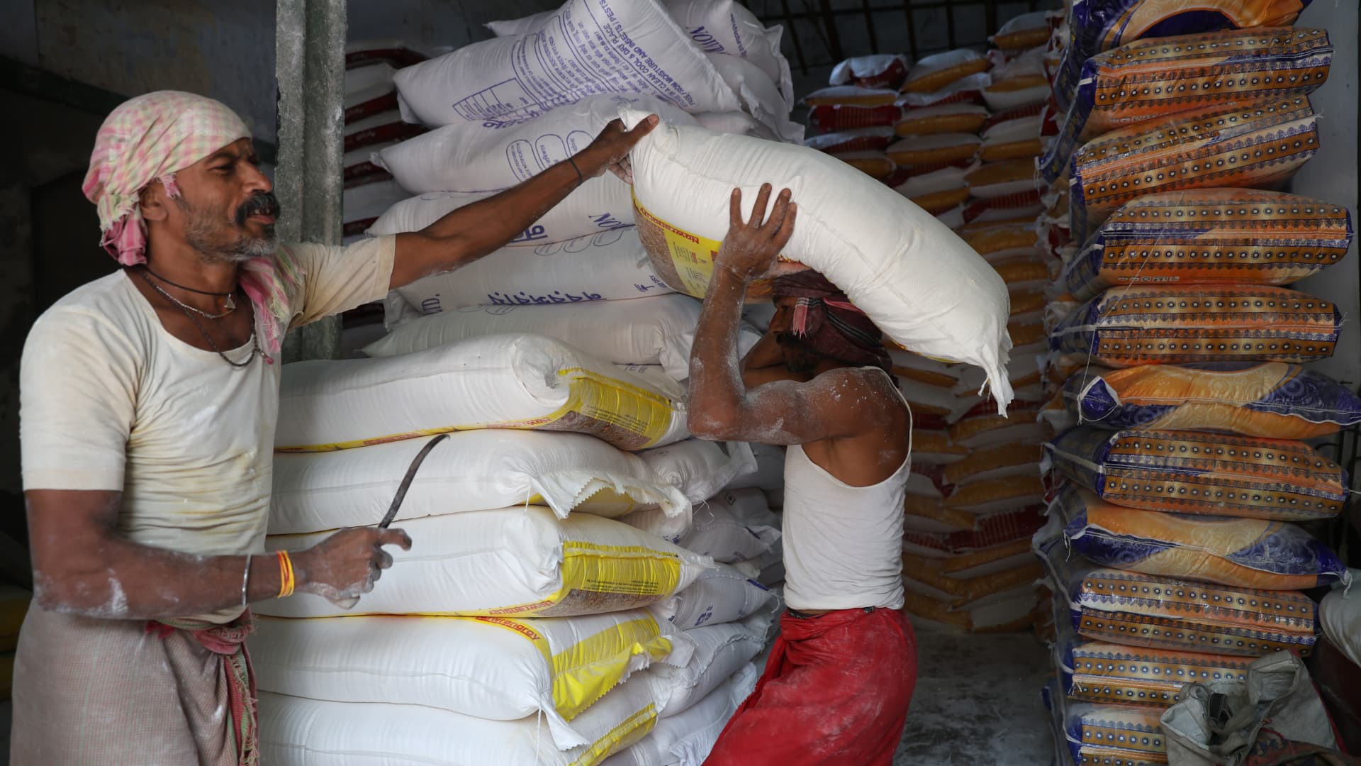 A worker has a sack full of refined wheat flour to load it in a supply truck in a wholesale market in Kolkata, India, on April 10, 2025.